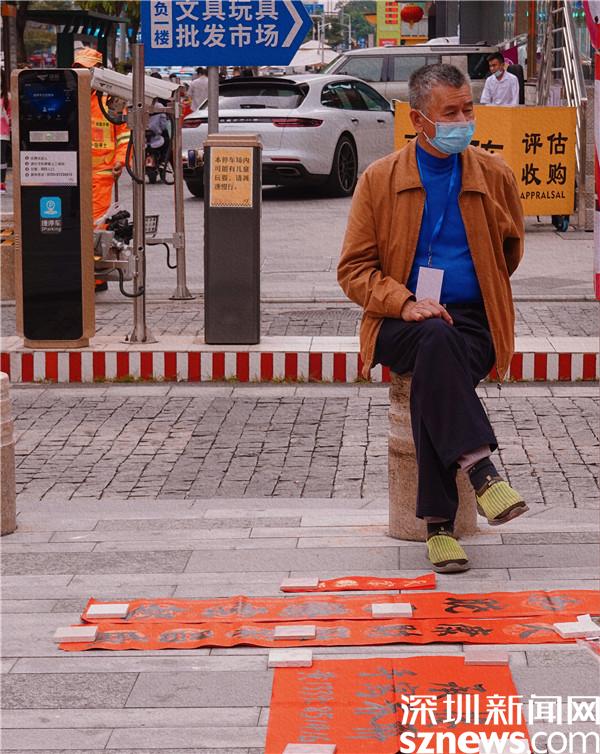 年貨市集的入口前,大爺支起了書(shū)法攤,邊上是還在地上等晾干的春聯(lián),這是年前才能看到的景象。