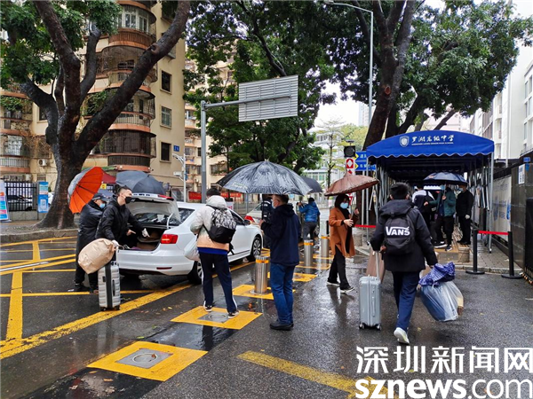 上午8:00左右,深圳市羅湖高級中學(xué)高三學(xué)子陸續(xù)返校。大雨雖然下個不停,但是學(xué)生們返校的心情卻絲毫沒有受到影響。在校門口,老師、學(xué)校物業(yè)工作人員為學(xué)生們撐傘、對行李進(jìn)行消毒、協(xié)助掃碼填報信息,有序幫助學(xué)生接過行李并用小推車運(yùn)送至宿舍樓?!斑@次開學(xué)和以往開學(xué)有所不同,我的感觸也很深。下著大雨,老師們忙前忙后為我們運(yùn)送行李,覺得非常感動。”羅湖高級中學(xué)高三學(xué)子張睿說道。