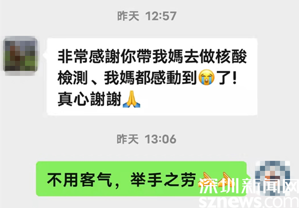 聽(tīng)說(shuō)深圳疫情嚴(yán)峻,李曉萍已經(jīng)幾天沒(méi)有出門,想去做核酸檢測(cè),又不會(huì)操作。她在香港的兒子也十分擔(dān)憂,卻無(wú)能為力。劉珍蓮主動(dòng)提出陪老人去做核酸檢測(cè),老人很開(kāi)心,跟著劉珍蓮來(lái)到核酸檢測(cè)點(diǎn),劉珍蓮幫她實(shí)名驗(yàn)證,幫她調(diào)出粵核酸碼,她采樣時(shí),劉珍蓮在一旁守候。此情此景讓老人激動(dòng)不已,就出現(xiàn)了開(kāi)頭的一幕。