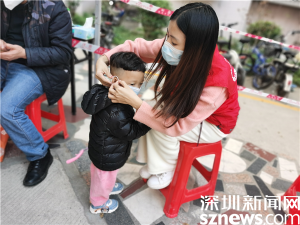 社工在核酸現(xiàn)場(chǎng)為沒(méi)有佩戴口罩的小朋友佩戴口罩。