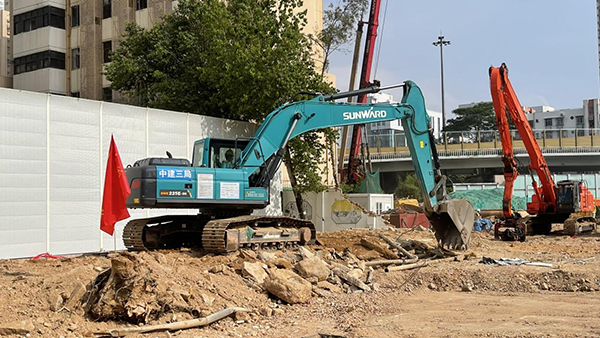 在施工現(xiàn)場(chǎng),著裝整齊的施工人員正頭戴安全帽、佩戴口罩,有序地投入施工建設(shè)。挖掘機(jī)、裝載機(jī)不停運(yùn)轉(zhuǎn)、轟鳴作響,現(xiàn)場(chǎng)一派熱火朝天的建設(shè)景象。