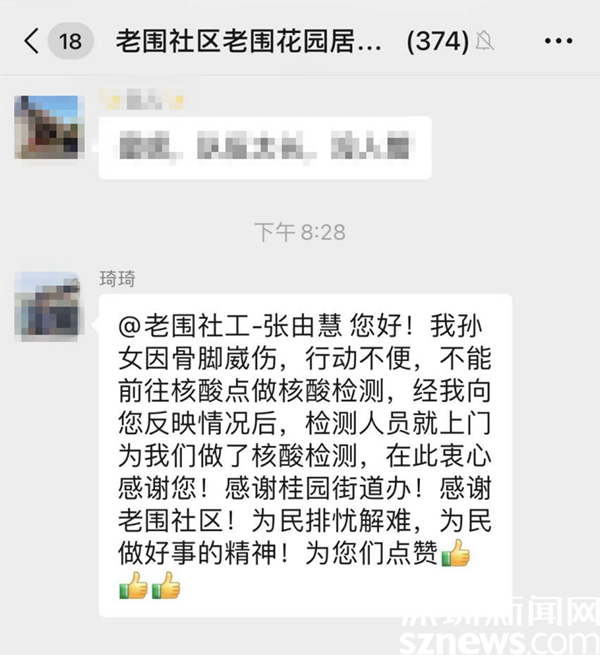 讀特客戶端·深圳新聞網(wǎng)2022年7月14日訊(記者 劉嘉敏 通訊員 楊紀(jì)歐)7月12日晚上8點(diǎn)多,羅湖區(qū)桂園街道老圍社區(qū)的居民琦琦在居民微信群里向社工張由慧說:“您好!我孫女因骨腳崴傷,行動(dòng)不便,不能前往核酸點(diǎn)做核酸檢測(cè),經(jīng)我向您反映情況后,檢測(cè)人員就上門為我們做了核酸檢測(cè),在此衷心感謝您!感謝桂園街道辦!感謝老圍社區(qū)!為民排憂解難,為民做好事的精神!為你們點(diǎn)贊。”