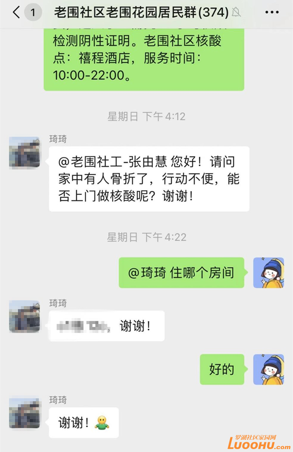 事情還要從7月10日的下午說起,正在家休息的張由慧,看到琦琦在社區(qū)居民群里求助:“@老圍社工-張由慧?您好!請(qǐng)問家中有人骨折了,行動(dòng)不便,能否上門做核酸呢?謝謝!”張由慧立刻回復(fù):“您的房間號(hào)(是什么)?”得到房間號(hào)后,張由慧通知社區(qū)網(wǎng)格員肖祥昌協(xié)助核實(shí)情況。肖祥昌從網(wǎng)格系統(tǒng)中找到琦琦的聯(lián)系方式,一通電話后,了解到琦琦的孫女不小心崴傷了腳,行動(dòng)不便,無法下樓做核酸。肖祥昌把情況通報(bào)給張由慧,張由慧立刻向社區(qū)黨委副書記黃小龍做了報(bào)備。