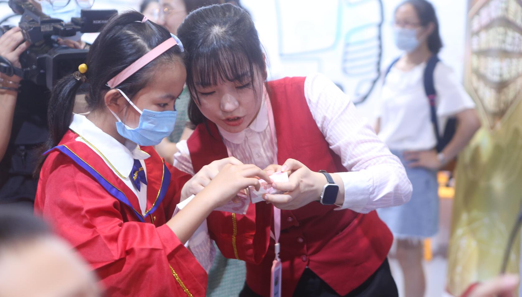 華夏銀行金牌點鈔手老師細心教導小飛俠們現(xiàn)場點鈔