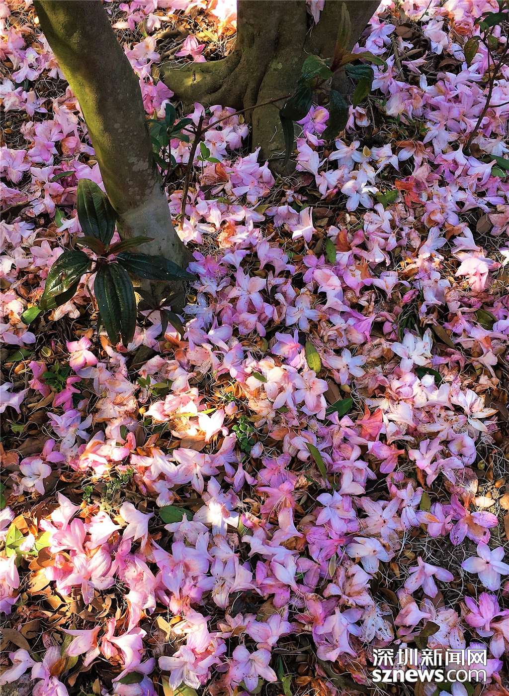 地上掉落的毛棉杜鵑,看起來很有意境