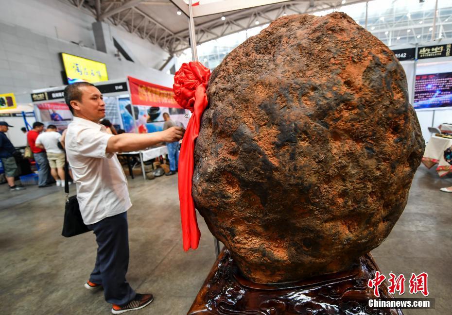 6月15日,第十一屆新疆觀賞石、和田玉精品博覽會在新疆烏魯木齊開幕,本次博覽會參展種類涵蓋珠寶、玉石、礦石、隕石、觀賞石等,吸引眾多奇石玩家到場“以石會友”,打造獨(dú)具特色的“品石”盛宴。圖為一塊重達(dá)3.5噸的鐵隕石,任何鐵制品一旦靠近便被吸附。中新社記者劉新 攝