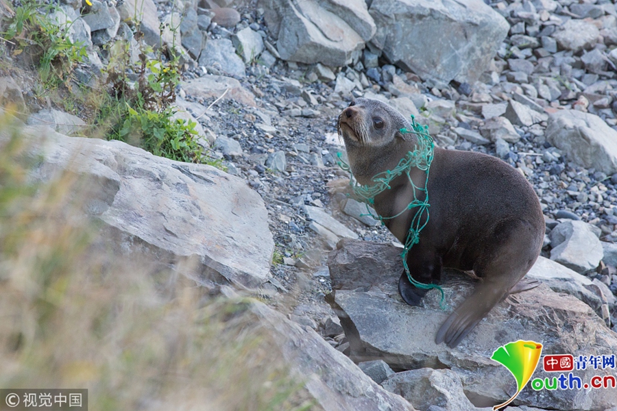 落單的海豹被漁民的繩子套住脖子。圖片作者/視覺中國