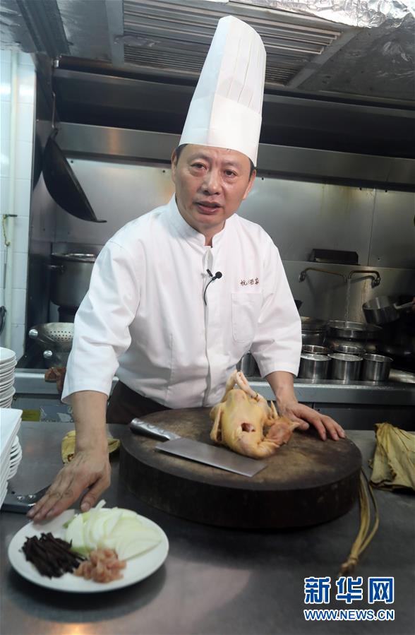 杭州酒家老板吳瑞康向記者介紹“叫化雞”的制作工序(6月16日攝)。 金庸在武俠小說《神雕俠侶》中借郭靖之口說過: “為國為民,俠之大者?!蔽鋫b精神在香港備受推崇,有其心向中華文化的情感基礎(chǔ)。在這個國際美食之都,品味舌尖上的武俠味,內(nèi)中的感覺別有深意。新華社記者 李鵬 攝