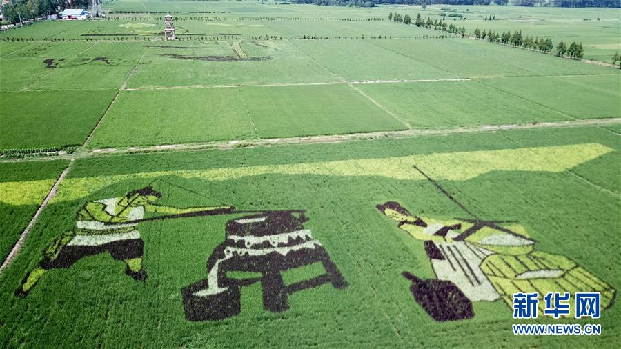 這是7月29日在安徽壽縣安豐塘水庫(kù)北堤拍攝的“稻田畫(huà)”(無(wú)人機(jī)拍攝)。 新華社記者 張端 攝