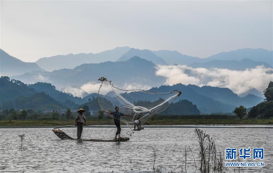 8月1日,淳安縣汾口鎮(zhèn)紅星村的漁民乘著竹排,在千島湖的支流武強(qiáng)溪上進(jìn)行撒網(wǎng)捕撈作業(yè)。 新華社記者 徐昱 攝