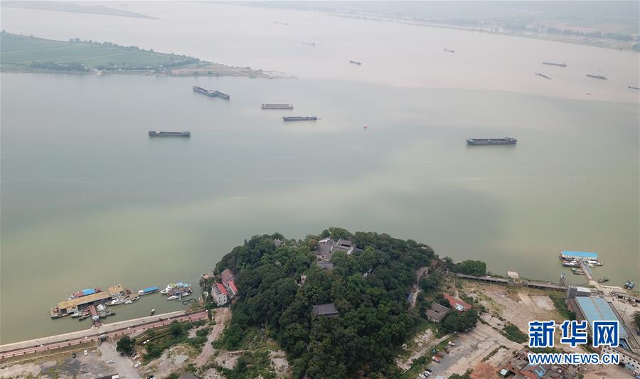 長江和鄱陽湖在江西省九江市湖口縣石鐘山附近交匯,形成江湖兩色美景(8月5日無人機拍攝)。 新華社記者 金立旺 攝