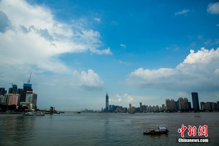 7月14日,一艘漁船停在長江和漢江交匯處,從漢陽南岸嘴望去漢江(左)與長江(右)“涇渭分明”。中新社記者 張暢 攝
