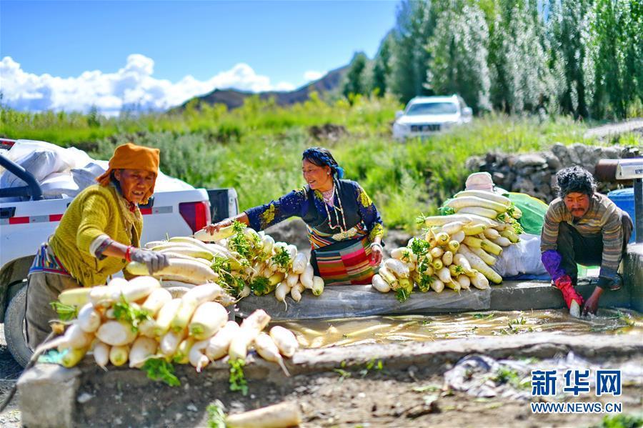 8月8日,村民在邊雄鄉(xiāng)蘿卜種植基地田頭的水池清洗蘿卜。