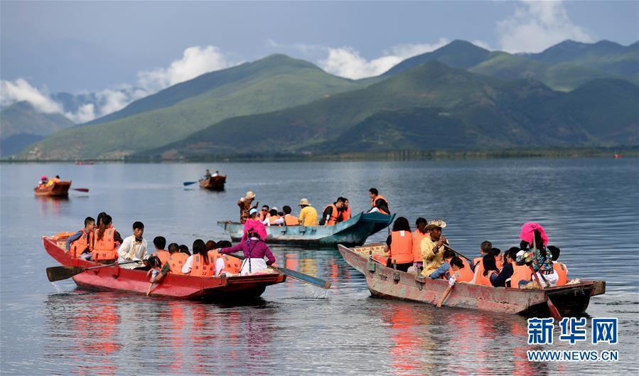 游客在瀘沽湖上坐船游覽(7月30日攝)。如今寧蒗永寧鄉(xiāng)落水村的摩梭群眾靠旅游服務(wù)實(shí)現(xiàn)脫貧致富。 新華社記者 藺以光攝
