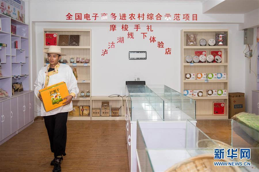 摩梭青年次里打史在寧蒗永寧鄉(xiāng)落水村的電子商務(wù)體驗(yàn)店里整理商品(7月31日攝)。 新華社記者 胡超 攝