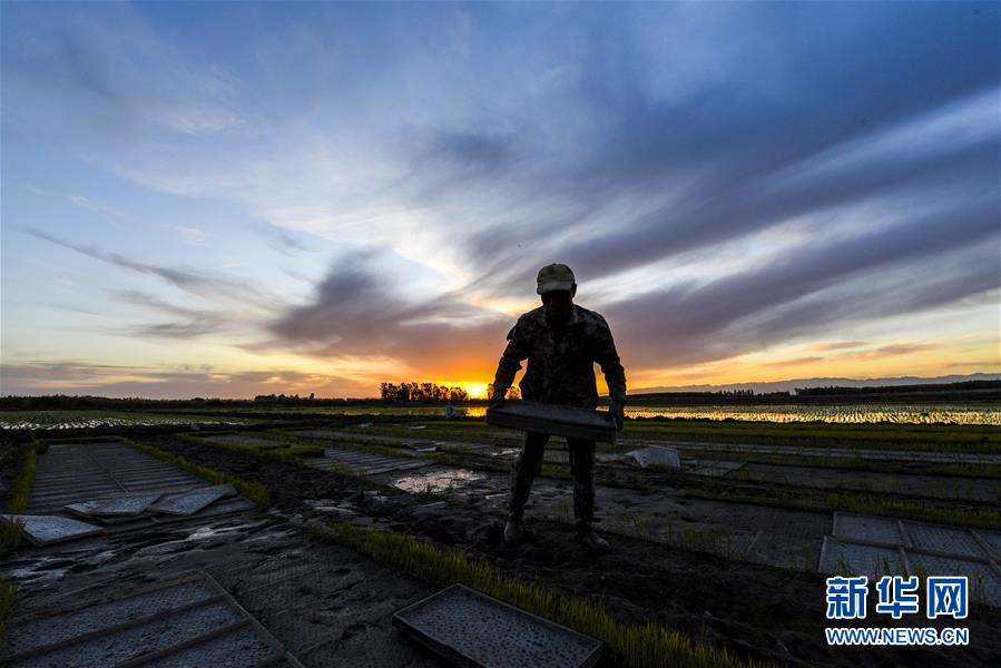 夕陽西下,村民在新疆察布查爾錫伯自治縣種羊場托海依村的一處農田里勞動(5月21日攝)。近日,隨著氣溫漸高,地處新疆伊犁河谷的察布查爾錫伯自治縣迎來插秧高峰期,田間地頭一派繁忙景象。塊塊稻田水滿如鏡,田間防護林枝繁葉茂,遠處雪山依稀可見,如一幅在大地上鋪展開的生態(tài)畫卷。新華社記者胡虎虎 攝