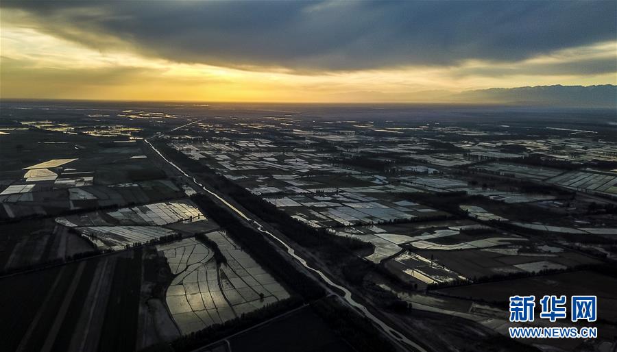 在新疆察布查爾錫伯自治縣種羊場托海依村拍攝的夕陽下的農(nóng)田(5月21日無人機(jī)拍攝)。近日,隨著氣溫漸高,地處新疆伊犁河谷的察布查爾錫伯自治縣迎來插秧高峰期,田間地頭一派繁忙景象。塊塊稻田水滿如鏡,田間防護(hù)林枝繁葉茂,遠(yuǎn)處雪山依稀可見,如一幅在大地上鋪展開的生態(tài)畫卷。新華社記者胡虎虎 攝