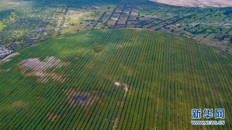 內(nèi)蒙古杭錦旗沙日召嘎查牧民白音道爾計(jì)種植的甘草等沙生植物(7月31日無人機(jī)拍攝)。 新華社記者劉磊攝