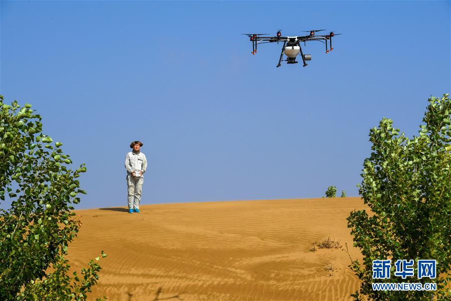 在內(nèi)蒙古鄂爾多斯市杭錦旗的庫布其沙漠中,技術(shù)人員操控?zé)o人機(jī)飛播造林(7月11日攝)。 巍巍陰山南麓,鄂爾多斯高原之北,橫臥著一條長約400公里、寬5-65公里的黃色“長龍”。它似弓弦,將滔滔黃河拉出一個(gè)大大的“幾”字彎。 這是中國第七大、也是距北京最近的沙漠——庫布其沙漠,曾經(jīng)寸草不生,風(fēng)沙肆虐,被稱為“死亡之?!?。 幾十年來,庫布其人一代接著一代干,書寫了一部荒漠化治理的英雄史詩。 新華社記者 彭源 攝
