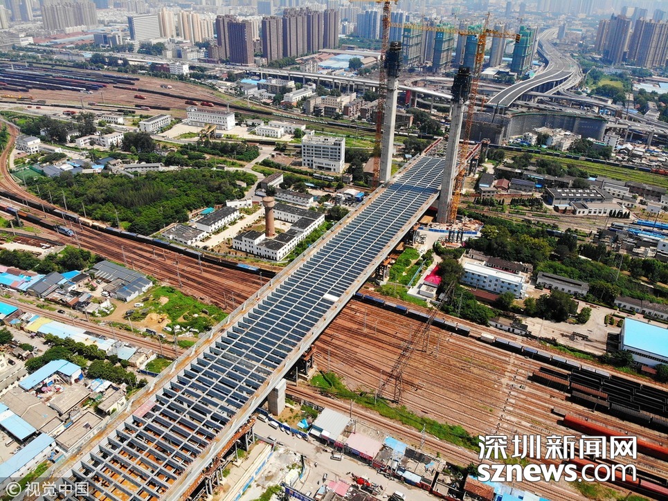 在橋梁頂推的同時,設(shè)計高度為150米的主塔也在不斷“長高”,目前高度為130米?!爸魉跇蛄耗媳眱蓚?cè)各有一個,均為每次(8~10天)升高6米。”閆斌說,主塔預(yù)計在9月中旬澆筑到位,10月份將安裝斜拉索。