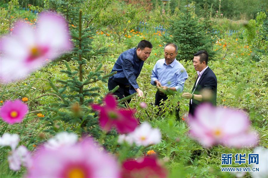 在寧夏固原市西吉縣吉強鎮(zhèn)龍王壩村,固原市農(nóng)業(yè)學(xué)校林業(yè)高級講師鄧志力(中)在指導(dǎo)村民進(jìn)行油用牡丹種植(8月30日攝)。