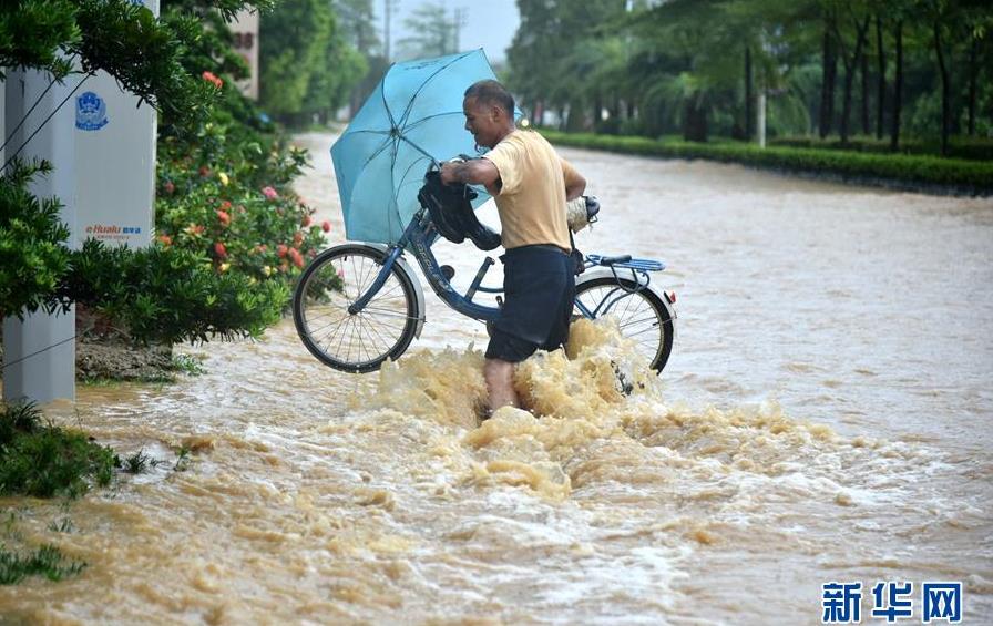 9月17日,陽春市一位市民在積水嚴重的街道上騎行。 當日,今年第22號臺風“山竹”過境后的廣東陽江陽春市遭遇暴雨襲擊,城市部分區(qū)域出現(xiàn)內澇。 新華社記者周科攝