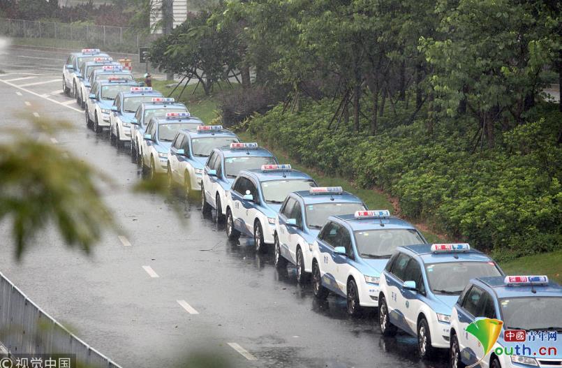 2018年9月16日,受臺風(fēng)山竹影響,全市的電動車充電站暫停使用。深圳市民樂P+R停車場外,停滿了等待充電站開門的電動出租車。