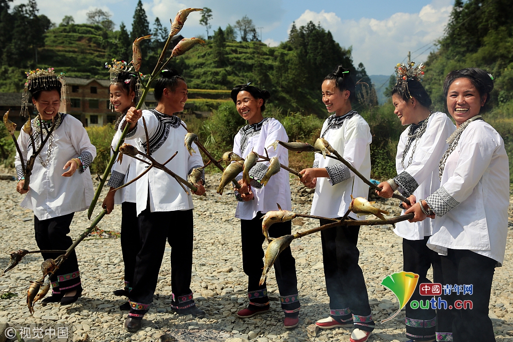 2016年9月17日,貴州省榕江縣平陽鄉(xiāng)硐里村七位侗家婦女們正燒魚。每年中秋時(shí)節(jié),當(dāng)?shù)囟弊逋_田放水,捉魚,全寨男女老少,野外生起篝火烤魚,用烤魚、米酒等,祭祀魚神,祈禱魚糧豐收的傳統(tǒng)民俗活動(dòng)。