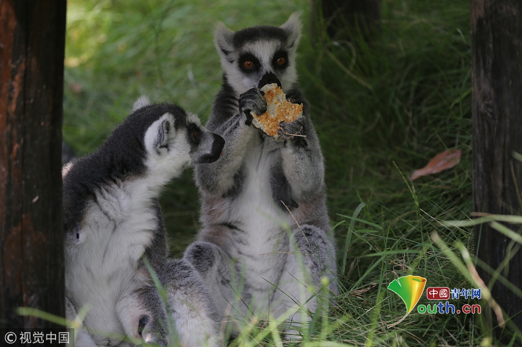 2017年10月4日,重慶永川樂和樂都的動物飼養(yǎng)員給環(huán)尾狐猴喂食月餅。