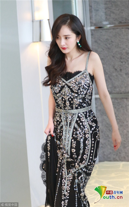 楊冪卷發(fā)成熟美露香肩 自提裙擺過酒店大堂