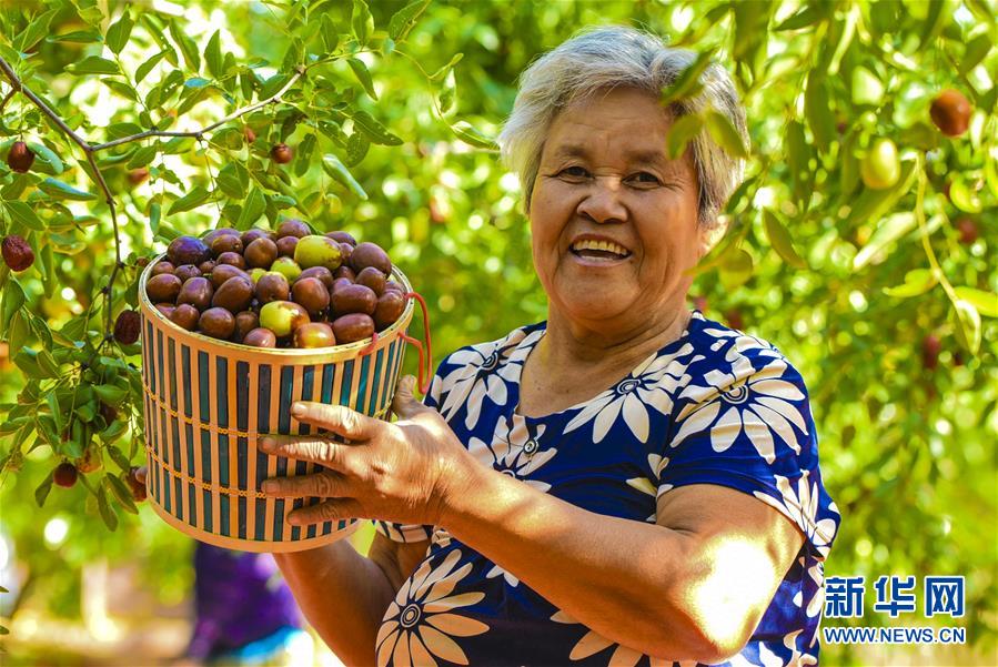 9月22日,河北省棗強(qiáng)縣棗強(qiáng)鎮(zhèn)孟家莊村的棗農(nóng)在展示剛剛收獲的紅棗。 近日,河北省棗強(qiáng)縣的2000多畝棗園迎來(lái)收獲季,棗農(nóng)們搶抓農(nóng)時(shí),采摘、篩選、晾曬紅棗,樂(lè)享秋收的快樂(lè)。 新華社記者李曉果攝