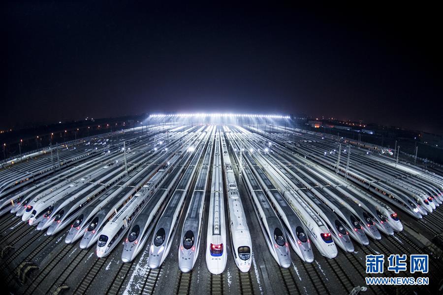 2018年2月1日凌晨,動(dòng)車組??吭谖錆h動(dòng)車段的存車線上,準(zhǔn)備進(jìn)行檢修和保溫作業(yè)。近百組在武漢動(dòng)車段經(jīng)過(guò)檢修、保溫作業(yè)的動(dòng)車組蓄勢(shì)待發(fā),迎接春運(yùn)。新華社記者 肖藝九 攝