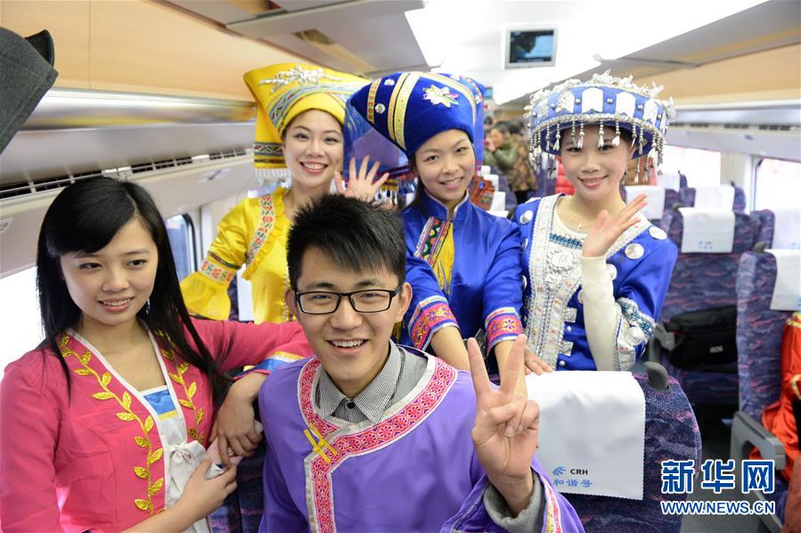 在廣西南寧站,身著民族服裝的乘客搭乘動(dòng)車準(zhǔn)備出行(2013年12月30日攝)。 廣西壯族自治區(qū)成立60年來(lái),鐵路建設(shè)發(fā)生翻天覆地的變化。來(lái)自中國(guó)鐵路南寧局集團(tuán)有限公司的數(shù)據(jù)顯示,1958年廣西鐵路總里程為1346.3公里,如今廣西鐵路總里程達(dá)5191公里。廣西與周邊相鄰省份間實(shí)現(xiàn)動(dòng)車“公交化”開行。此外,北部灣港—重慶班列、東盟海產(chǎn)品冷鏈班列、“百色一號(hào)”果蔬專列等的開通和運(yùn)營(yíng),強(qiáng)化了鐵路供給的針對(duì)性和有效性。鐵路成為助推廣西經(jīng)濟(jì)社會(huì)快速發(fā)展的“大動(dòng)脈”。 新華社記者周華攝