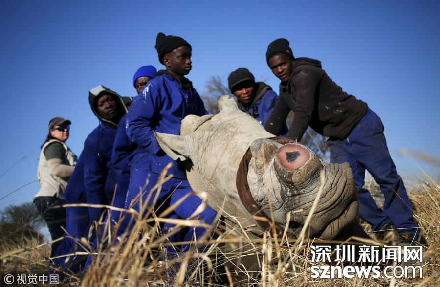當?shù)貢r間2017年8月14日,南非西北省,一名工作人員在為一頭犀牛鋸角,這是一種保護犀牛的行為,可以防止它們喪命于偷獵者的槍口下。