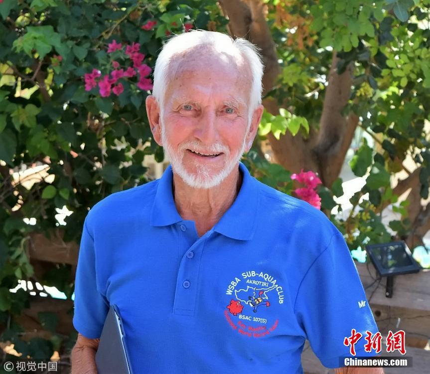 當(dāng)?shù)貢r(shí)間2018年9月1日,塞浦路斯,95歲的英國(guó)潛水員雷·伍利(Ray Woolley)以44分鐘下潛40.5米的成績(jī)打破了自己94歲達(dá)成的記錄(41分鐘下潛38.1米),二度刷新了世界上年齡最大的男性潛水員最好成績(jī)。在此次下潛中,這位二戰(zhàn)退伍老兵對(duì)距塞浦路斯南部城鎮(zhèn)拉納卡約2公里處的海域進(jìn)行了探索,1980年一艘名為“芝諾比亞號(hào)”(Zenobia)的貨船在這里進(jìn)行首次航行時(shí)沉沒。圖片來源:視覺中國(guó)
