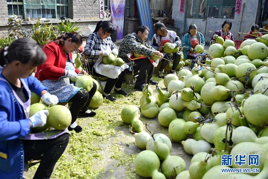 9月27日,山西省安澤縣和川鎮(zhèn)孔旺村的村民將葫蘆去皮。近日,山西省安澤縣和川鎮(zhèn)孔旺村種植的葫蘆喜獲豐收,村民們忙著將摘下的葫蘆去皮晾干。孔旺村于2016年成立葫蘆種植合作社,種植、采摘、加工等環(huán)節(jié)全部由貧困戶負(fù)責(zé),為貧困戶拓寬增收渠道。新華社記者 曹陽(yáng) 攝