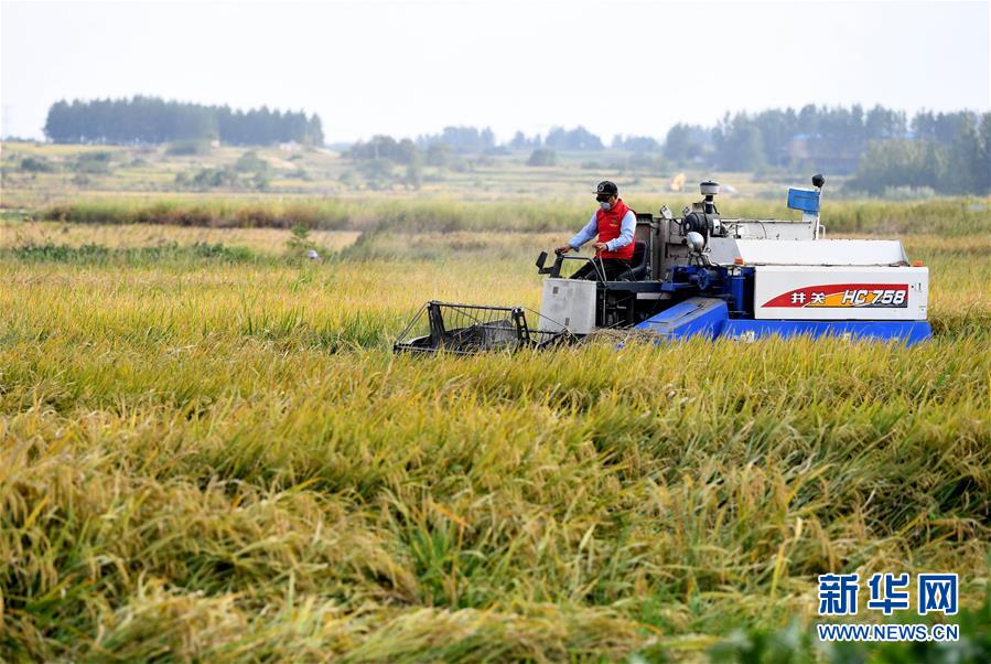 9月27日,在鳳陽縣小崗村,農(nóng)民駕駛收割機收割水稻。新華社記者 劉軍喜 攝