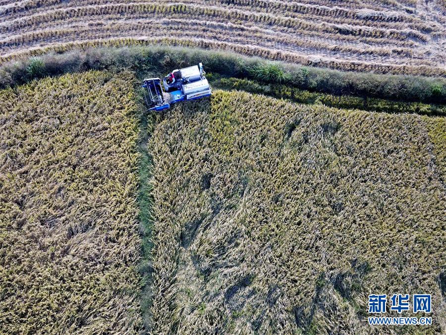 9月27日,在鳳陽(yáng)縣小崗村,農(nóng)民駕駛收割機(jī)收割水稻(無人機(jī)拍攝)。新華社記者 劉軍喜 攝