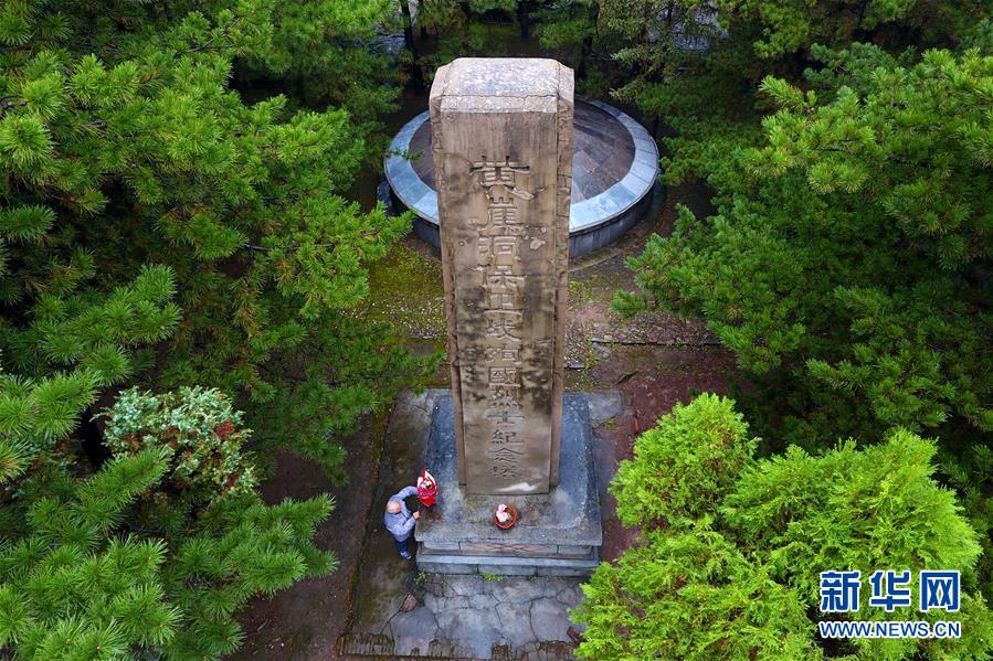 在黃崖洞烈士陵園,趙乃堂將花擺在黃崖洞保衛(wèi)戰(zhàn)殉國烈士紀念塔前(9月19日無人機拍攝)。 新華社記者 詹彥 攝