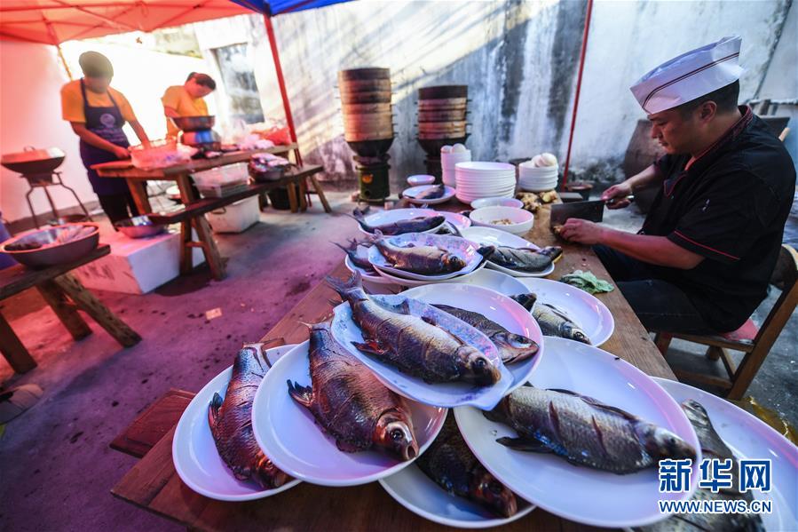 9月30日,工作人員在準(zhǔn)備江鮮宴席。當(dāng)日,浙江省杭州市富陽區(qū)場口鎮(zhèn)東梓關(guān)村開啟“江鮮第一鍋”,幾位大廚聯(lián)手在直徑1.5米的大鍋內(nèi)烹制美味江鮮,這也是當(dāng)?shù)亍敖r大會(huì)”的重頭戲。東梓關(guān)村有著1000多年歷史,古就是富春江南岸重要的商貿(mào)集散地,素有富春江“東流第一關(guān)”之稱。隨著近年來美麗鄉(xiāng)村建設(shè)的推進(jìn),東梓關(guān)村著力打造粉墻黛瓦的江南民居,同時(shí)依托富春江豐富的江鮮魚類資源,在秋季舉辦特色“江鮮大會(huì)”,通過江鮮捕撈體驗(yàn)、江鮮第一鍋、百鮮宴、農(nóng)家菜大賽等活動(dòng),吸引各地游客前來感受富春江漁民豐收的喜悅和千年古村的獨(dú)特魅力,推動(dòng)鄉(xiāng)村特色旅游發(fā)展。新華社記者徐昱攝