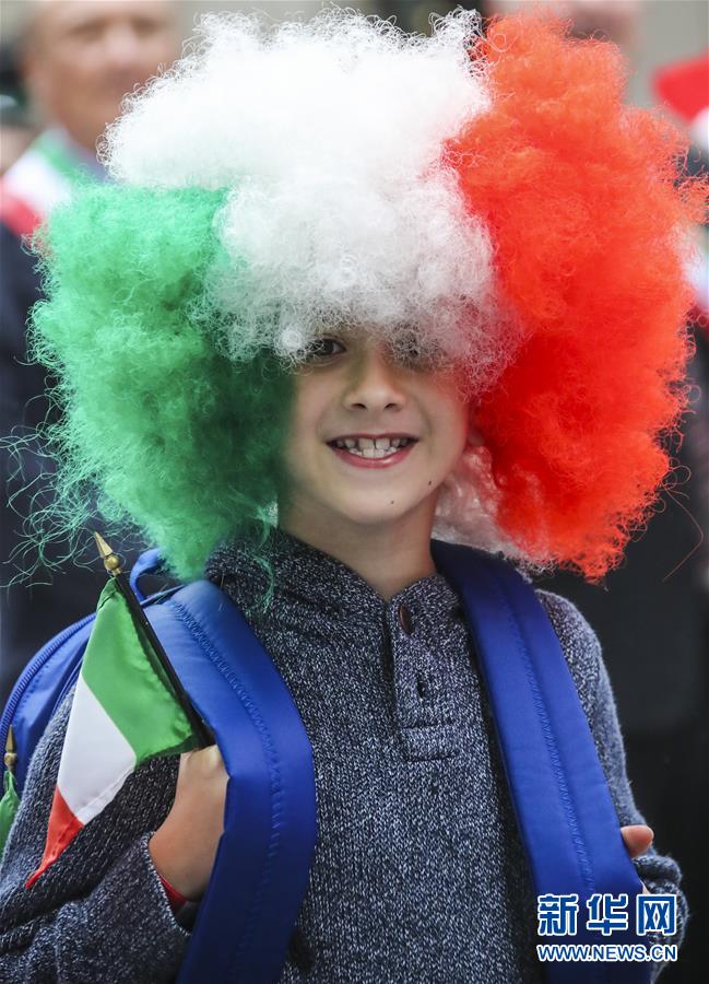 10月8日,在美國紐約曼哈頓第五大道,一名兒童參加哥倫布日游行。 新華社記者王迎攝