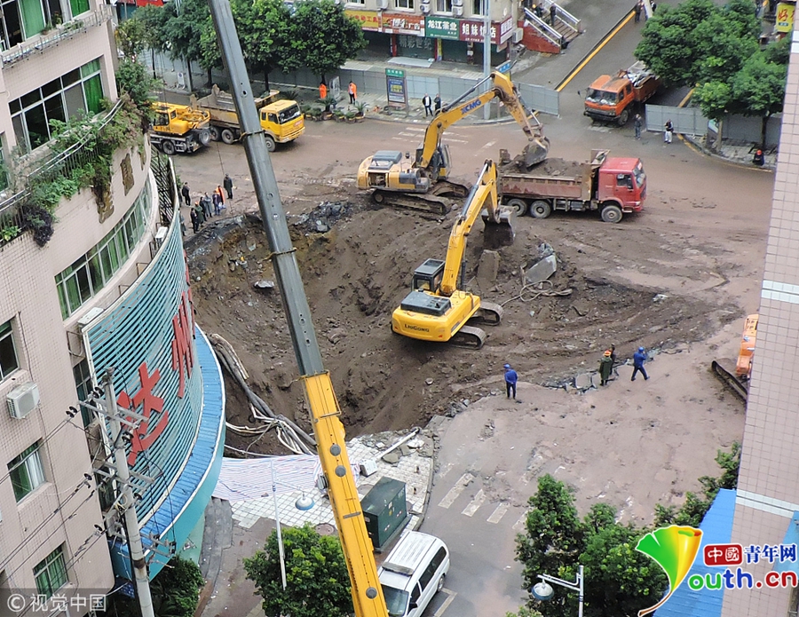 中國青年網(wǎng)北京10月9日電 2018年10月8日消息,四川達州。10月8日從四川省達州市達川區(qū)委宣傳部獲悉,7日14時30分左右,達川區(qū)東環(huán)南路103號人行道路面發(fā)生塌陷險情,經(jīng)調(diào)取視頻監(jiān)控和走訪周邊群眾,救援人員初步判斷疑似有4人掉入坑中。圖片作者:視覺中國