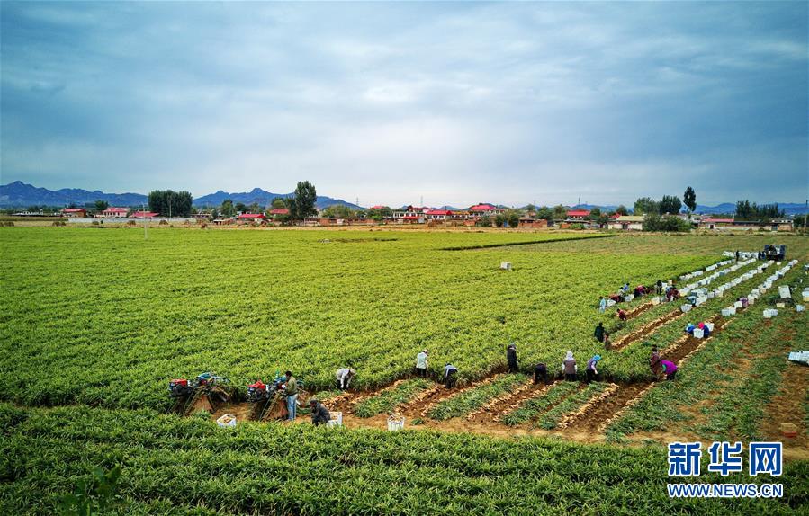 10月9日,秦皇島市撫寧區(qū)留守營鎮(zhèn)桑園村農(nóng)民在收獲生姜(無人機拍攝)。 近年來,河北省秦皇島市撫寧區(qū)在農(nóng)業(yè)結(jié)構(gòu)調(diào)整過程中,引導(dǎo)當(dāng)?shù)剞r(nóng)民種植優(yōu)質(zhì)無公害生姜,并安排農(nóng)業(yè)技術(shù)員定期到田間指導(dǎo)農(nóng)民對生姜進行標準化管理。據(jù)介紹,今年該縣生姜種植面積1萬多畝,預(yù)計產(chǎn)生姜5萬噸,種植戶每畝純收入達1萬多元。 新華社記者 楊世堯 攝