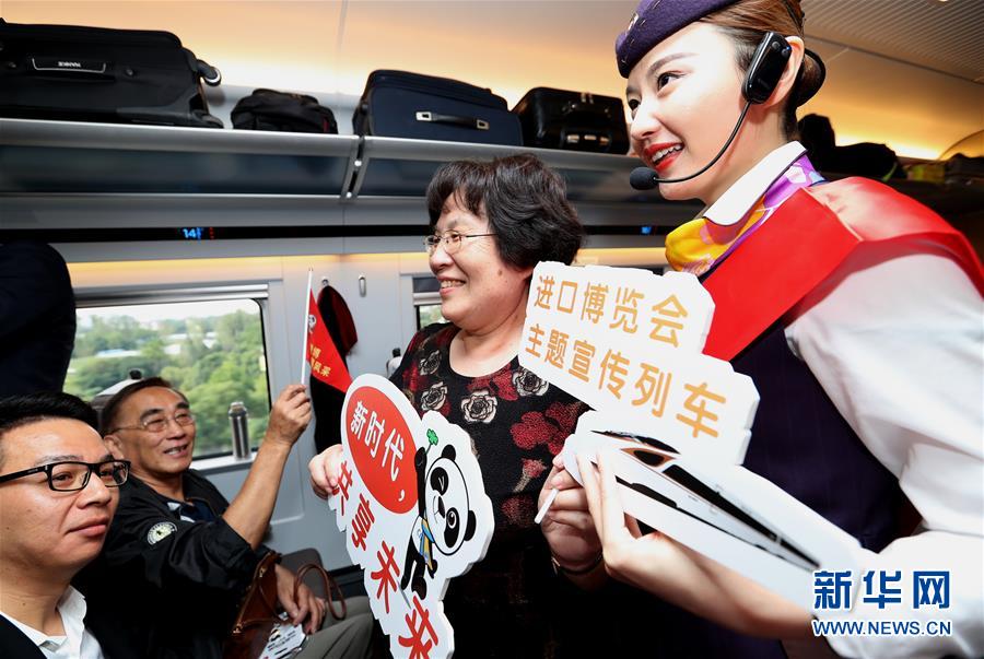 10月10日,G2次列車乘務(wù)員向旅客講解首屆中國(guó)國(guó)際進(jìn)口博覽會(huì)相關(guān)信息。 新華社記者陳飛攝