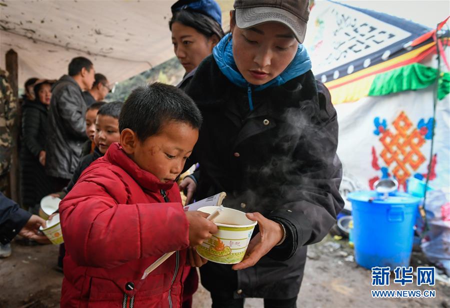 波羅鄉(xiāng)工作人員在臨時(shí)過渡安置點(diǎn)內(nèi)為波羅鄉(xiāng)第一小學(xué)學(xué)生盛晚飯(10月14日攝)。 新華社記者 劉東君 攝