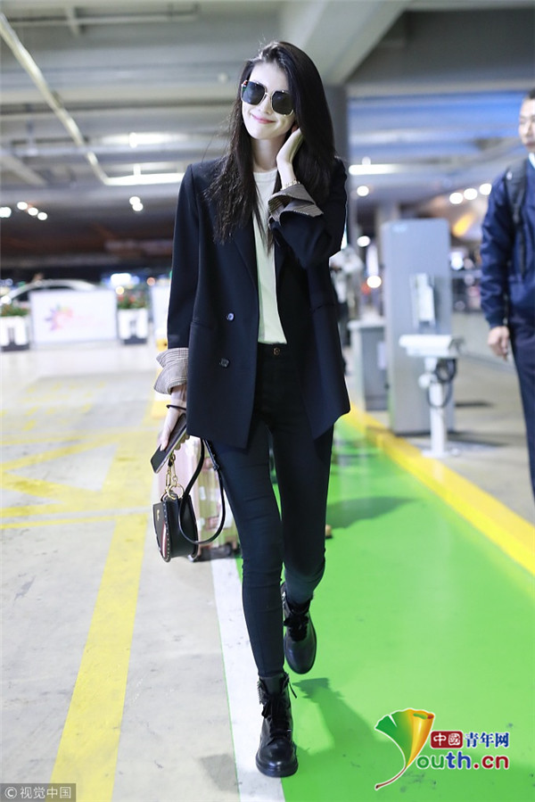 2018年10月15日,上海,何穗亮相機(jī)場(chǎng)。她身穿深色西裝搭配黑色緊身褲大秀超模身材,簡(jiǎn)約造型依舊高級(jí)感十足,輕撩秀發(fā)散發(fā)女人味。