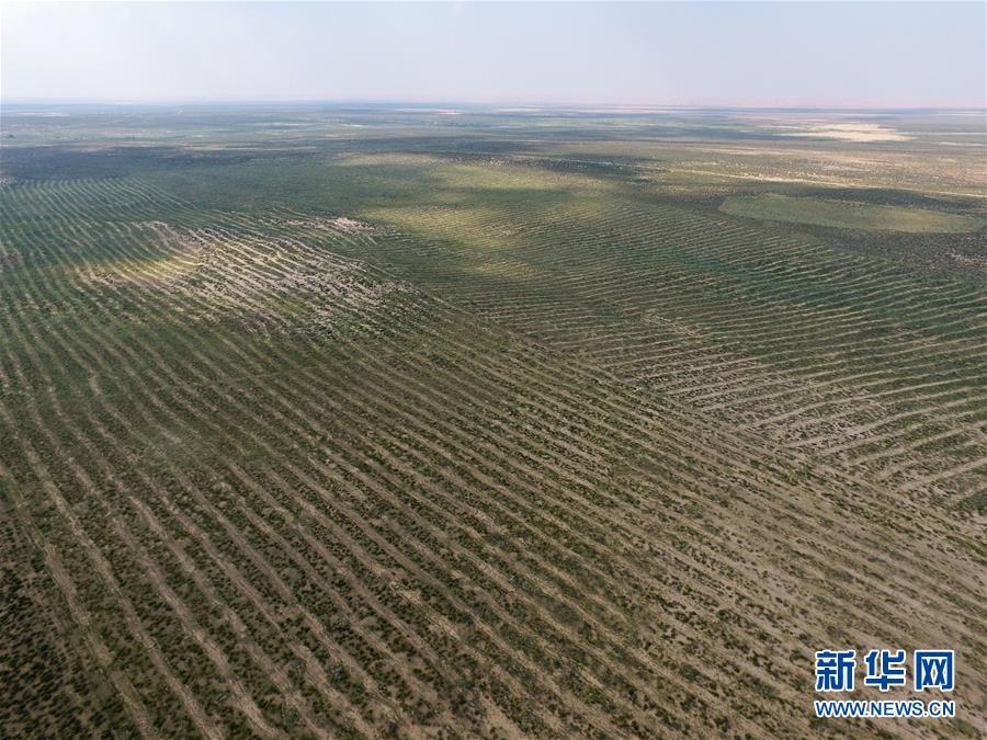 內(nèi)蒙古杭錦旗沙日召嘎查牧民白音道爾計種植的甘草等沙生植物(7月31日無人機拍攝)。 新華社記者劉磊攝