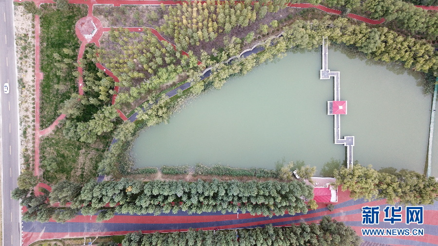 俯瞰恩格貝月亮湖。(新華網(wǎng) 王宇 攝)