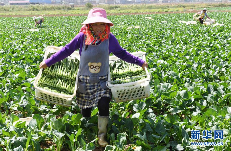 10月16日,硯山縣小補(bǔ)佐村的村民在種植基地收菜。 云南省文山壯族苗族自治州硯山縣稼依鎮(zhèn)小補(bǔ)佐村有55戶200多名壯族群眾曾經(jīng)居住在大山深處。2017年10月,在政府的幫扶下,小補(bǔ)佐村易地扶貧建設(shè)新村,村民全部搬遷入住新居。 新華社記者 楊宗友 攝