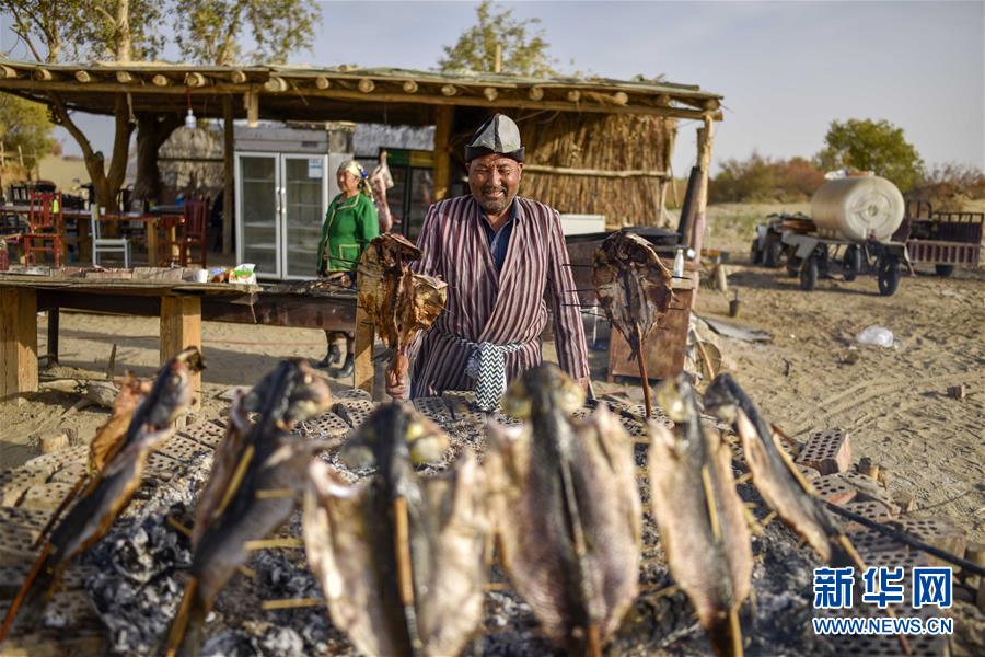10月16日,在羅布人村寨,村民阿木東·艾不東在制作烤魚。新華社記者 趙戈 攝